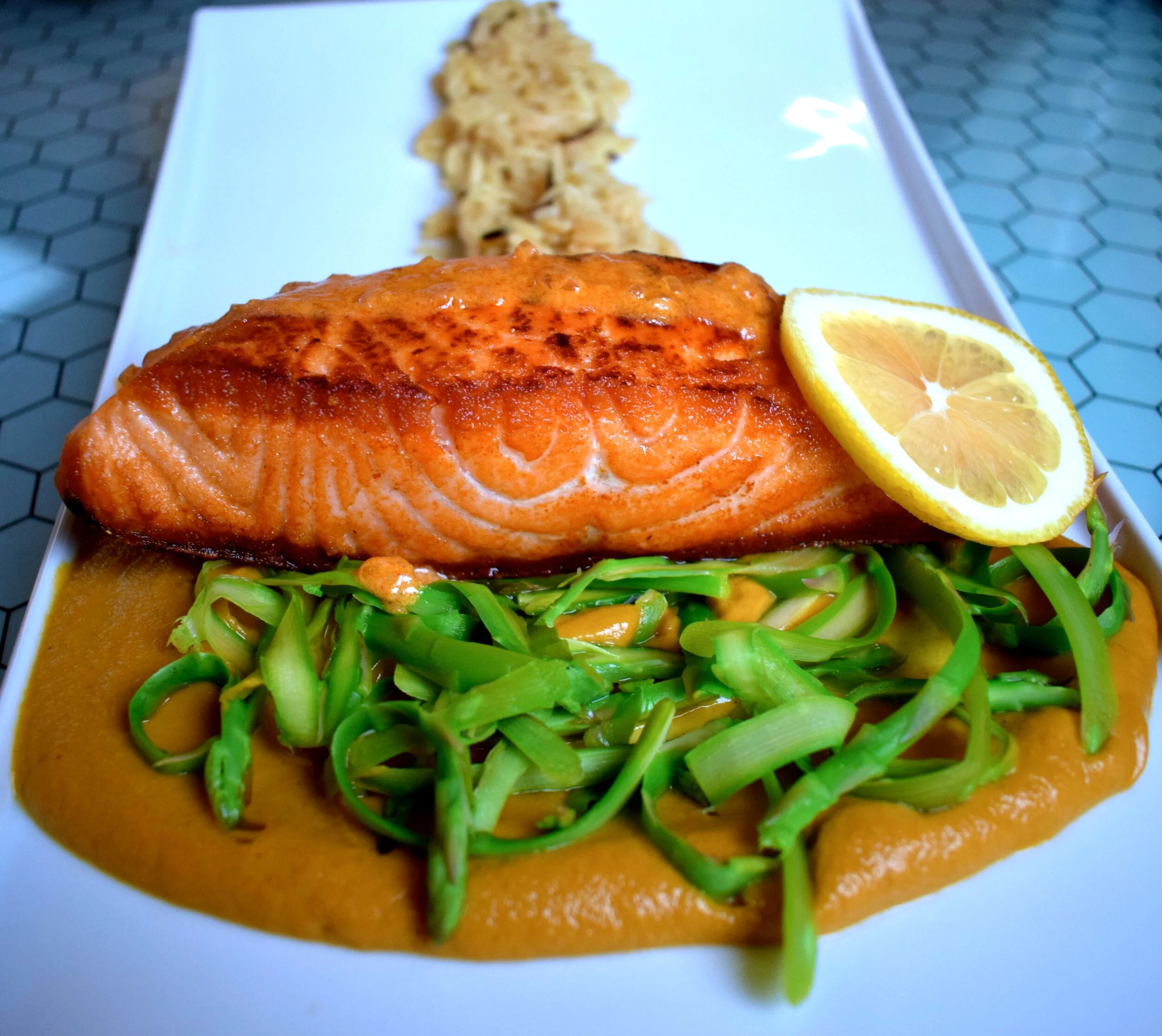 Seared Atlantic Salmon, roasted cauliflower and yam purée, wild long-grain rice, asparagus ribbons and chipotle butter cream sauce
