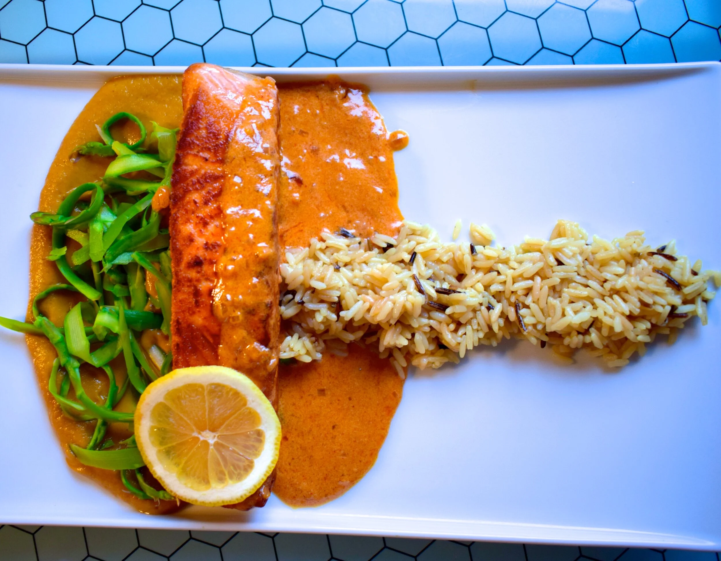 Seared Atlantic Salmon, wild rice, steamed asparagus, citrus beurre blanc sauce