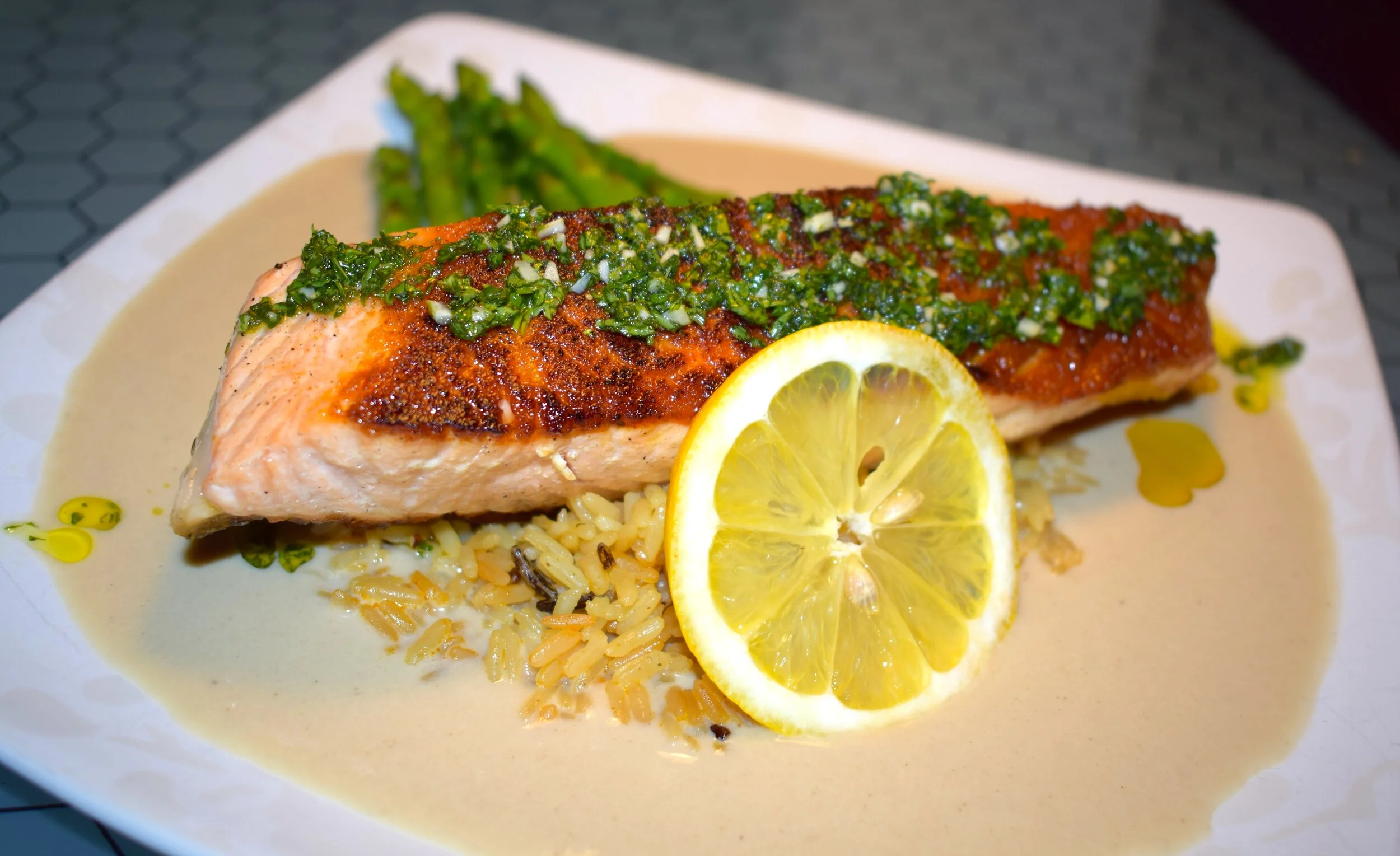 Seared Atlantic Salmon, creamy roasted cauliflower purée, wild rice, steamed asparagus, fresh chimichurri