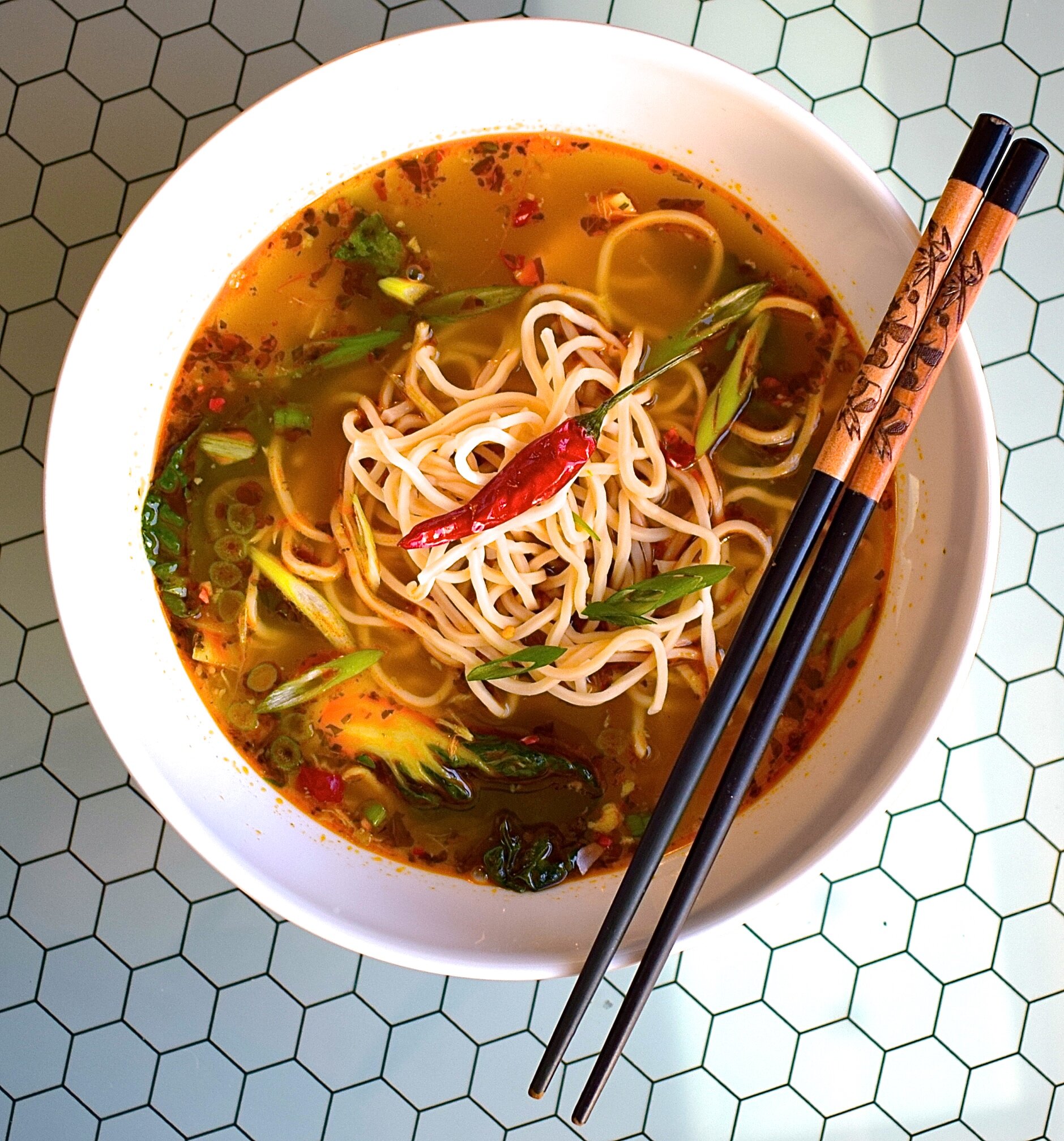 Thai Style Hot & Spicy Chicken Noodle Soup, red curry paste, fiery sambal olek, fresh green onion, rice noodles and baby bok choy