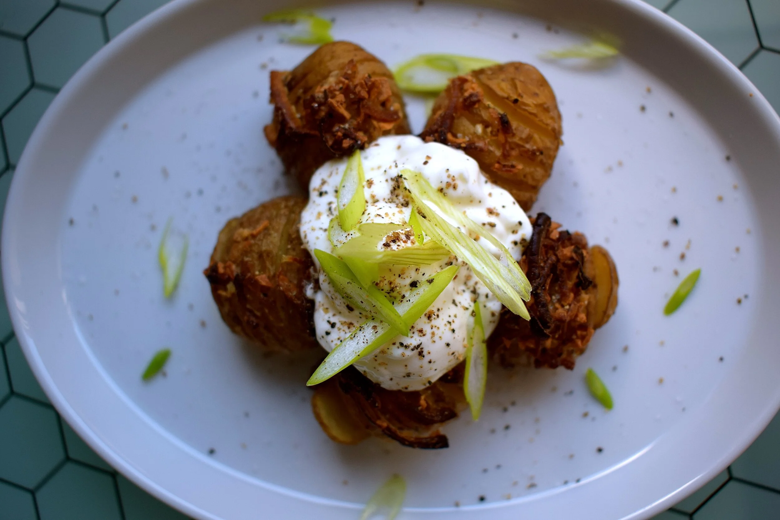 Hasselbeck Baby Potatoes, Crispy Shallots, Fresh Garlic, Cool Sour Cream, Green Onion