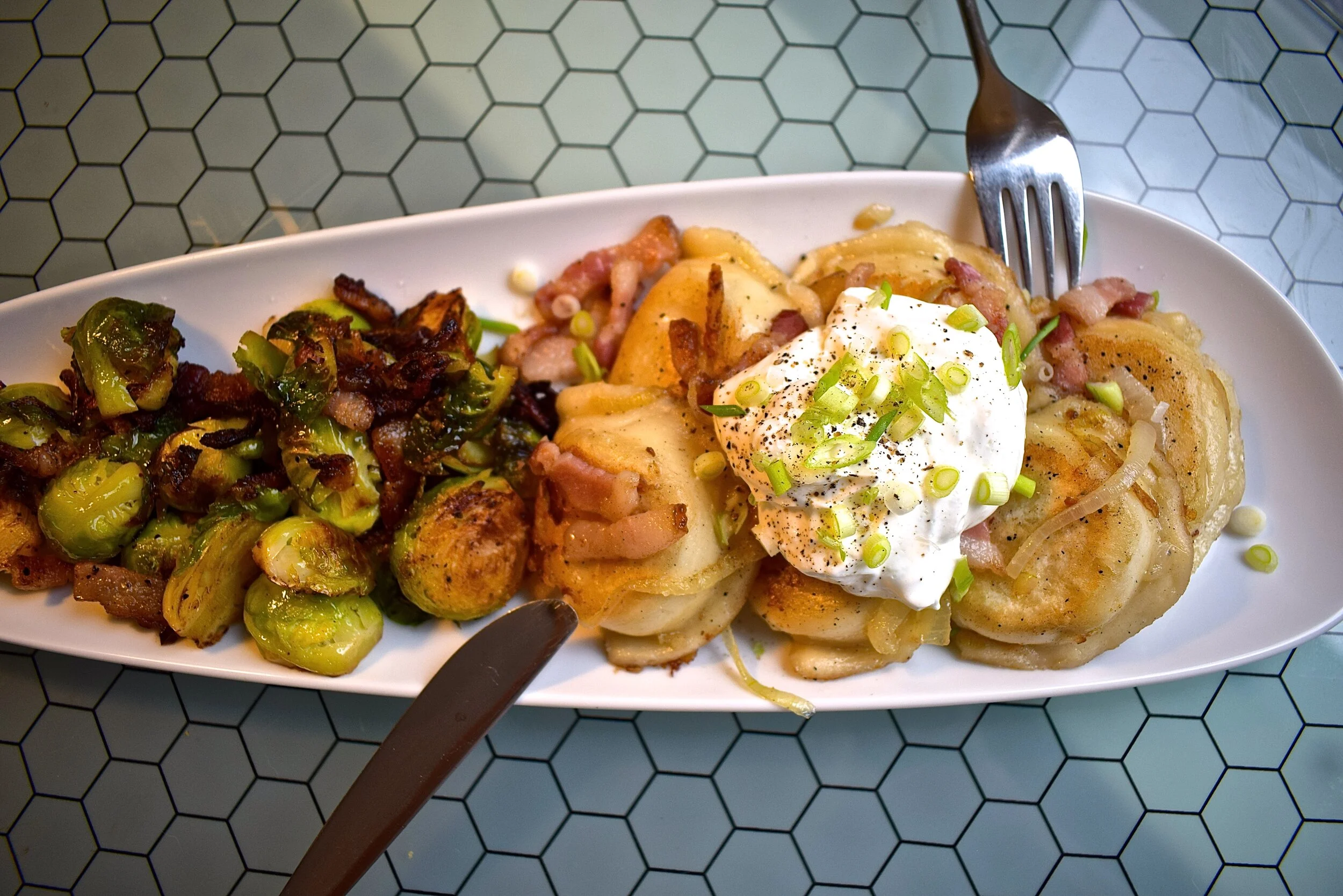 Pan-fried Aged Cheddar and Potato Pierogies with Maple Bacon Brussel Sprouts