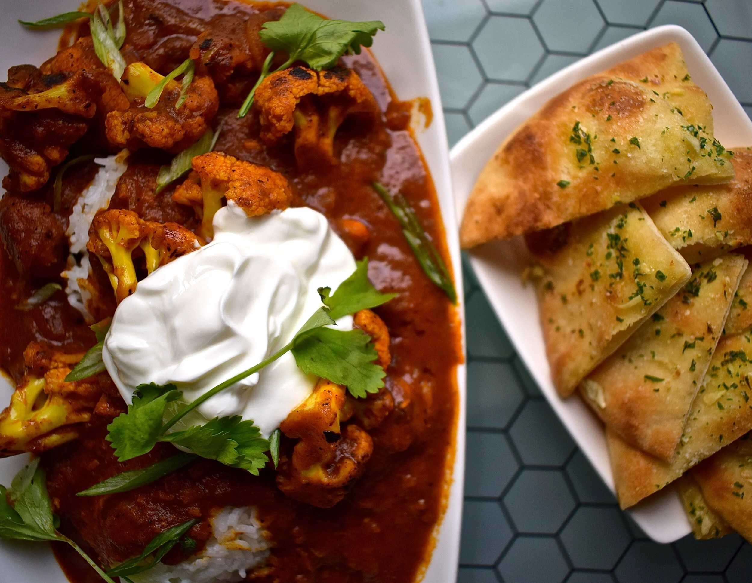 Vegan "Butter" Cauliflower, Fresh Indian Spices, Cool Coconut Cream, Garlic Naan Bread