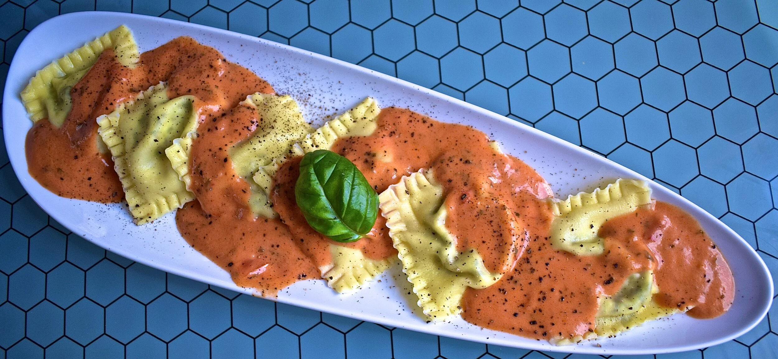 Spinach & Ricotta stuffed ravioli with creamy pesto Alfredo & aged parmesan.