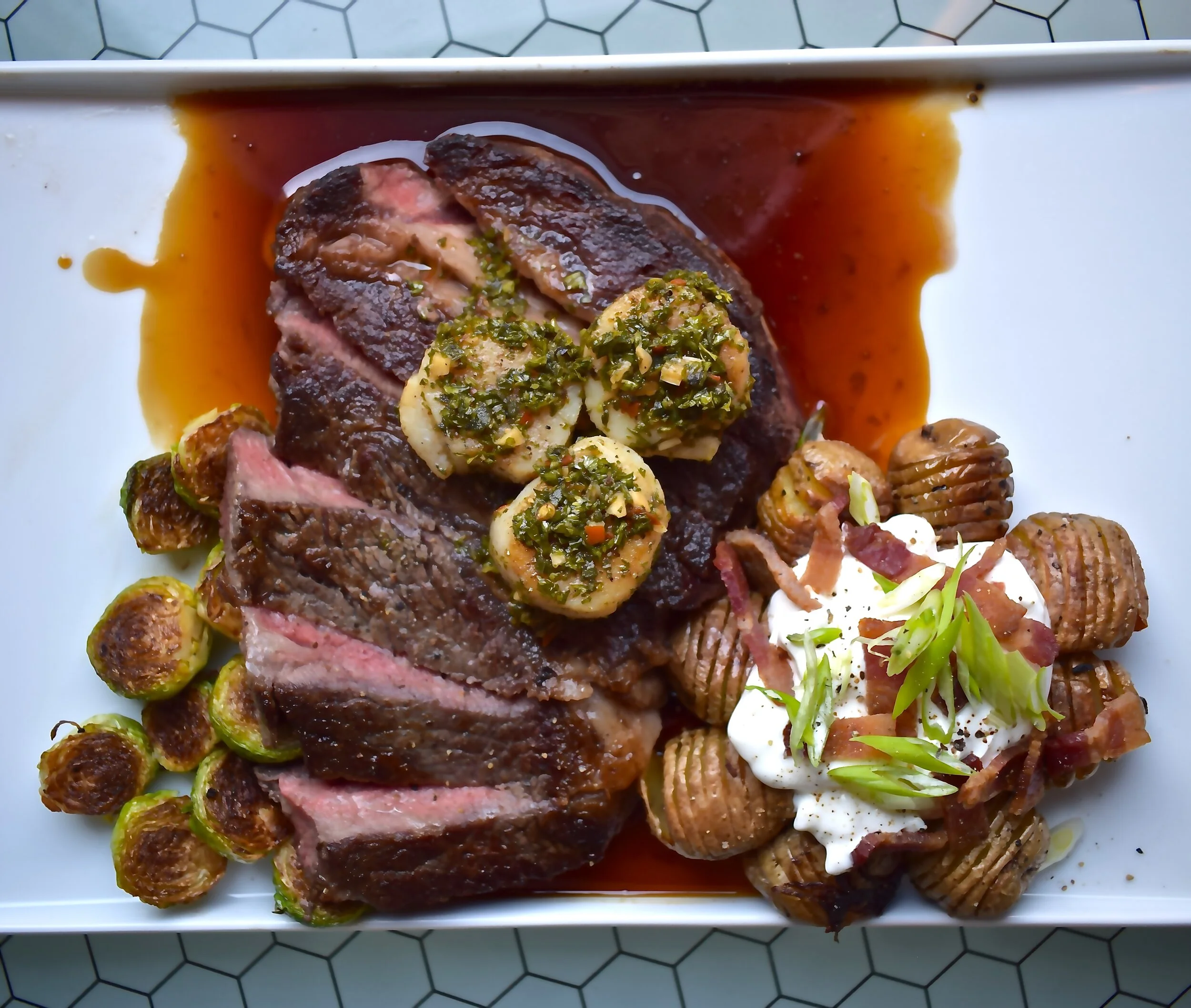 Tender and Juicy Dry-aged Canadian Ribeye, sweet seared chimichurri Diver Scallops, crispy, duck fat fried hasselback baby potatoes -fully dressed! Charred brussel sprouts, and savory veal demi-glacé.