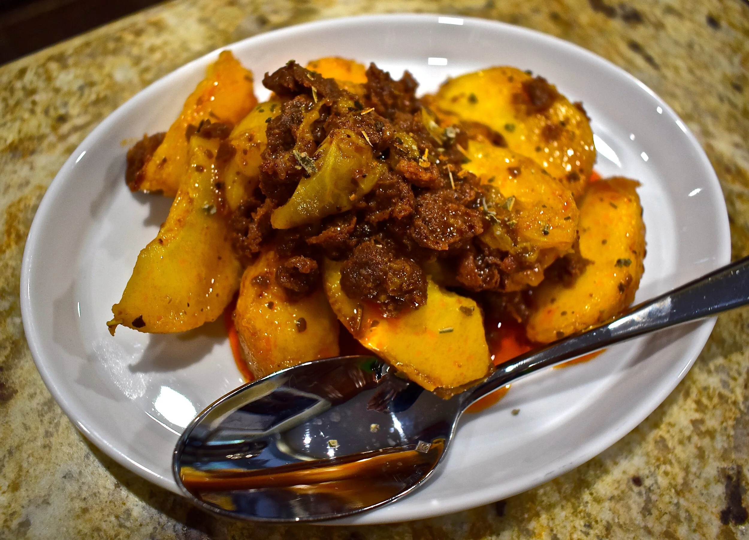 Spicy potato hash with farm-fresh fried eggs.