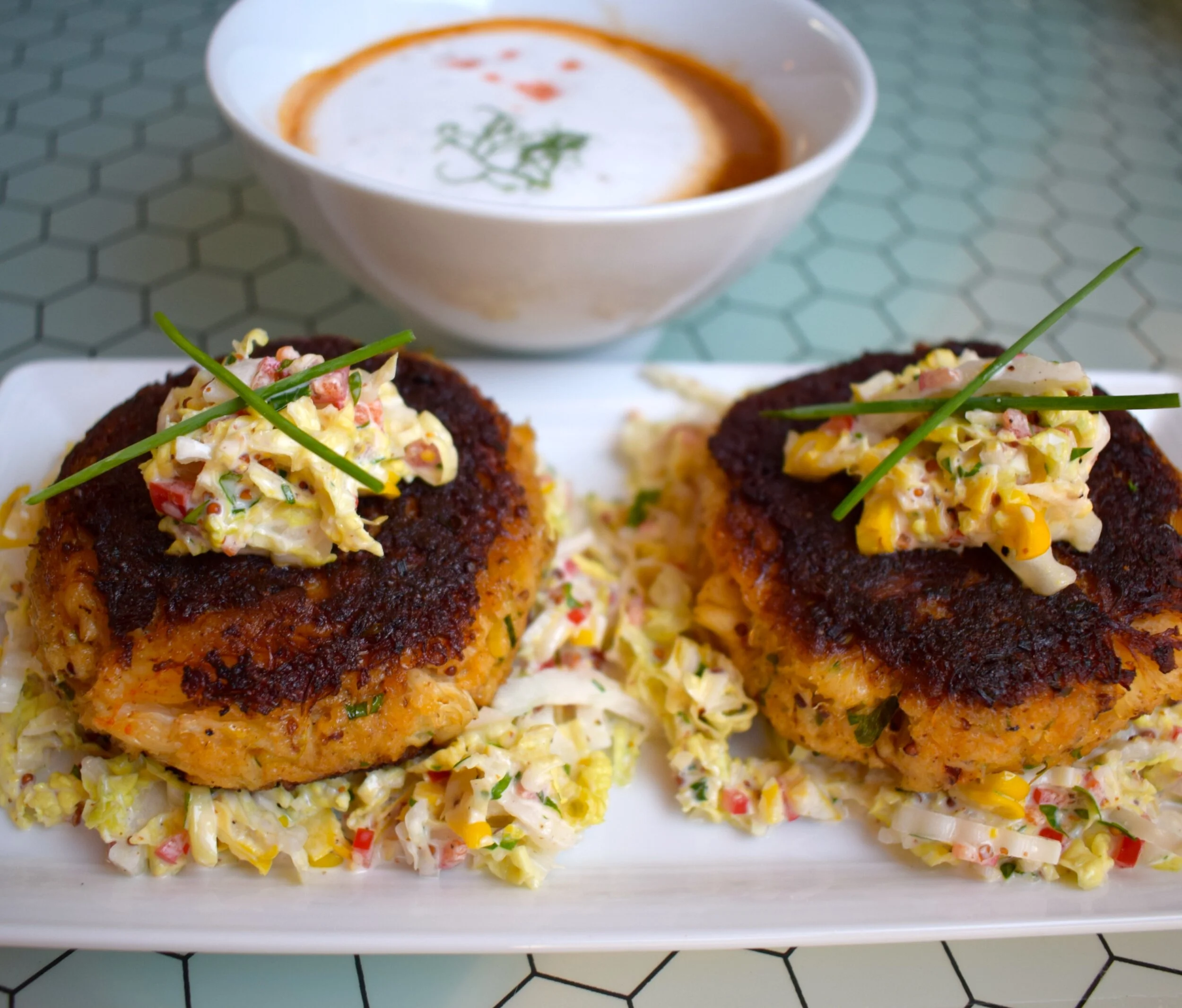 World's best crab cake! Roasted corn savoy slaw, grainy mustard remoulade.
