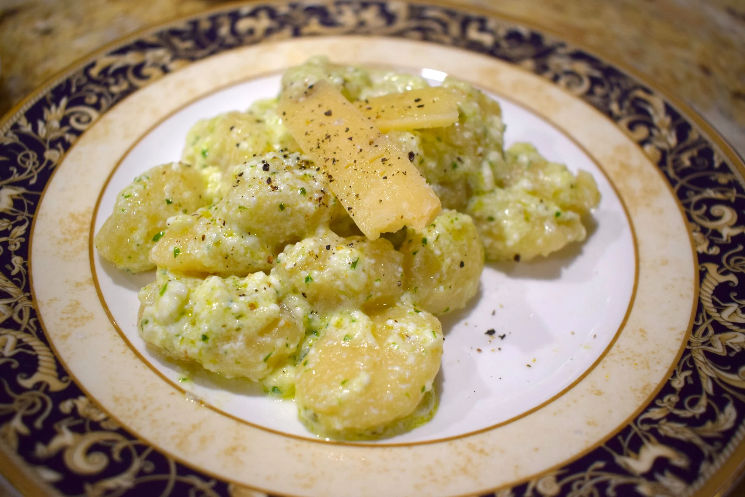 Tender potato gnocchi, creamy pesto sauce, aged parmesan reggiano, freshly cracked pepper