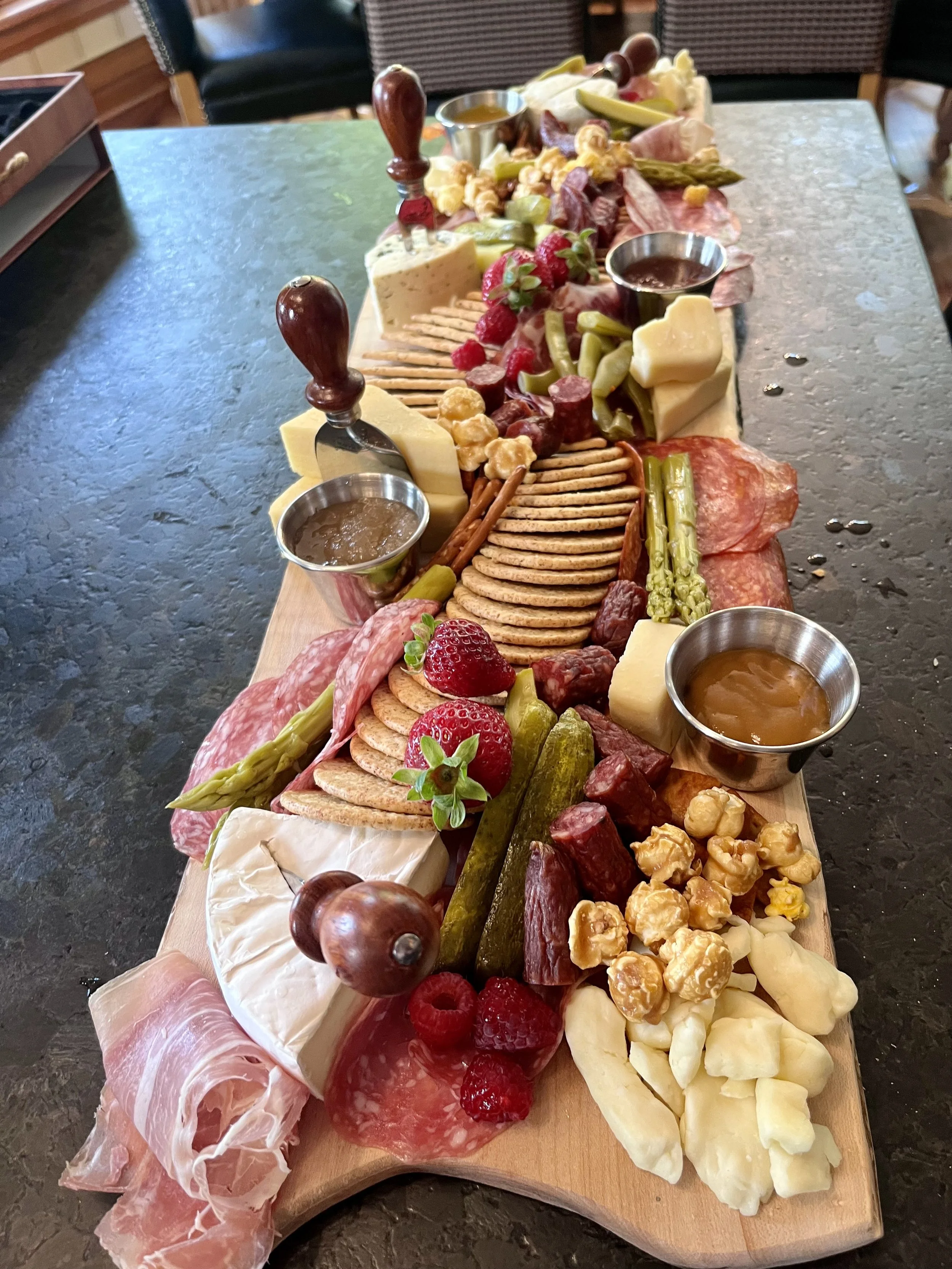 Large meat & cheese boards with local & imported meats & cheeses, pickled & fresh veggies, mustards & compotes.